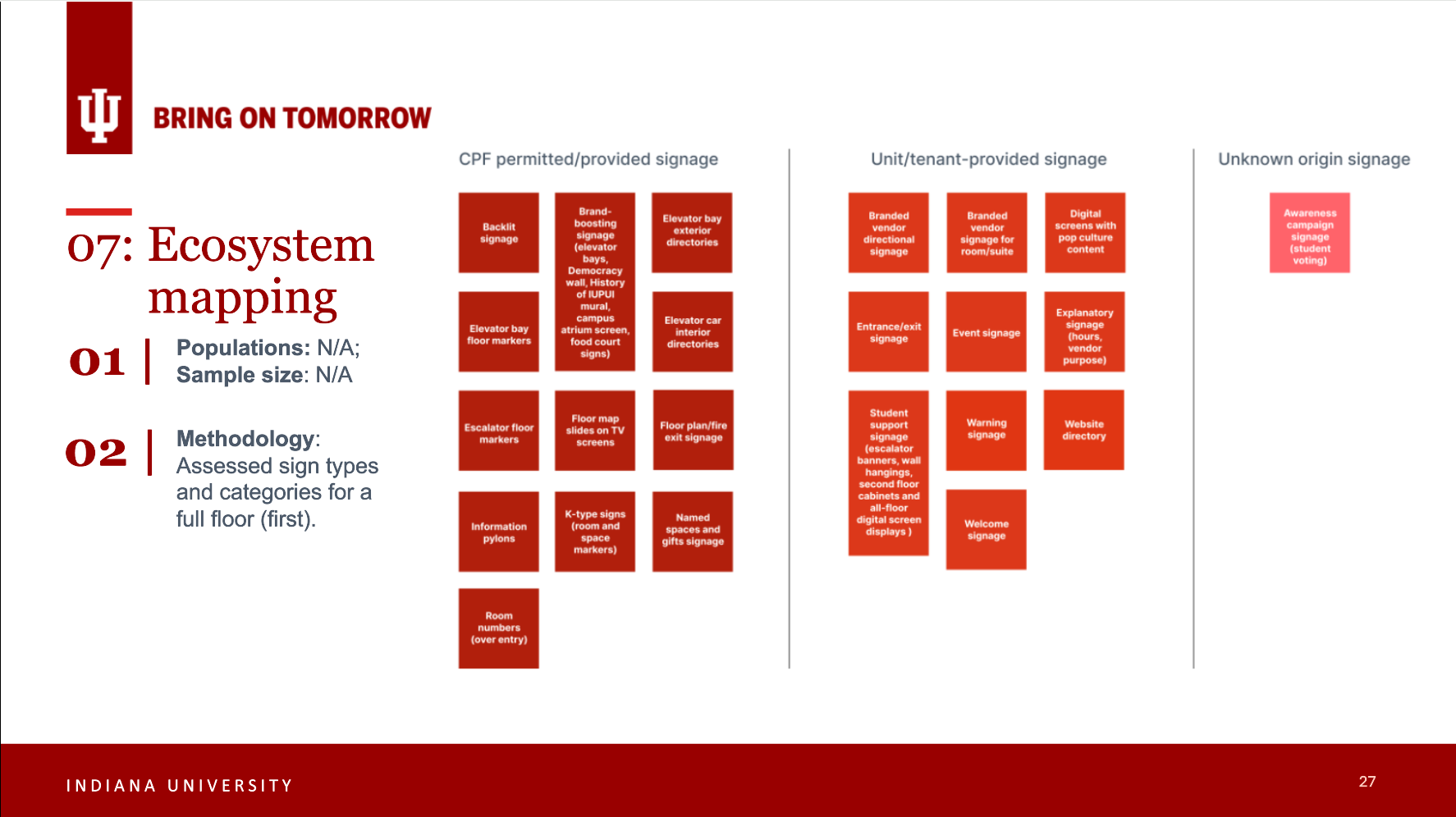 By unifying IU’s directional signage with high-profile landmark signage—through consistent typography, color hierarchy, iconography, and tone—the system can feel intentional and cohesive. This consistency strengthens brand presence while improving navigational confidence and ease of use.