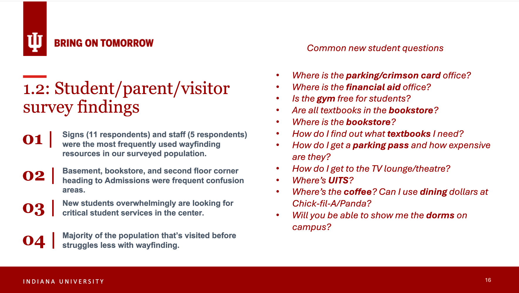 Ensure first-time visitors feel confident and oriented as they move through the Campus Center by evaluating the existing wayfinding system and designing research-backed solutions aligned with stakeholder and sponsor priorities.