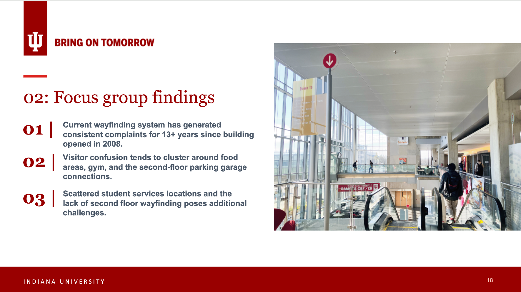 Often considered IU’s “front door” to the university, the Campus Center plays a pivotal role in shaping first impressions and supporting ongoing student needs. According to IU’s Division of Student Affairs, the building welcomes an estimated 1–2 million visitors annually—making clarity, accessibility, and seamless navigation essential to the overall campus experience.